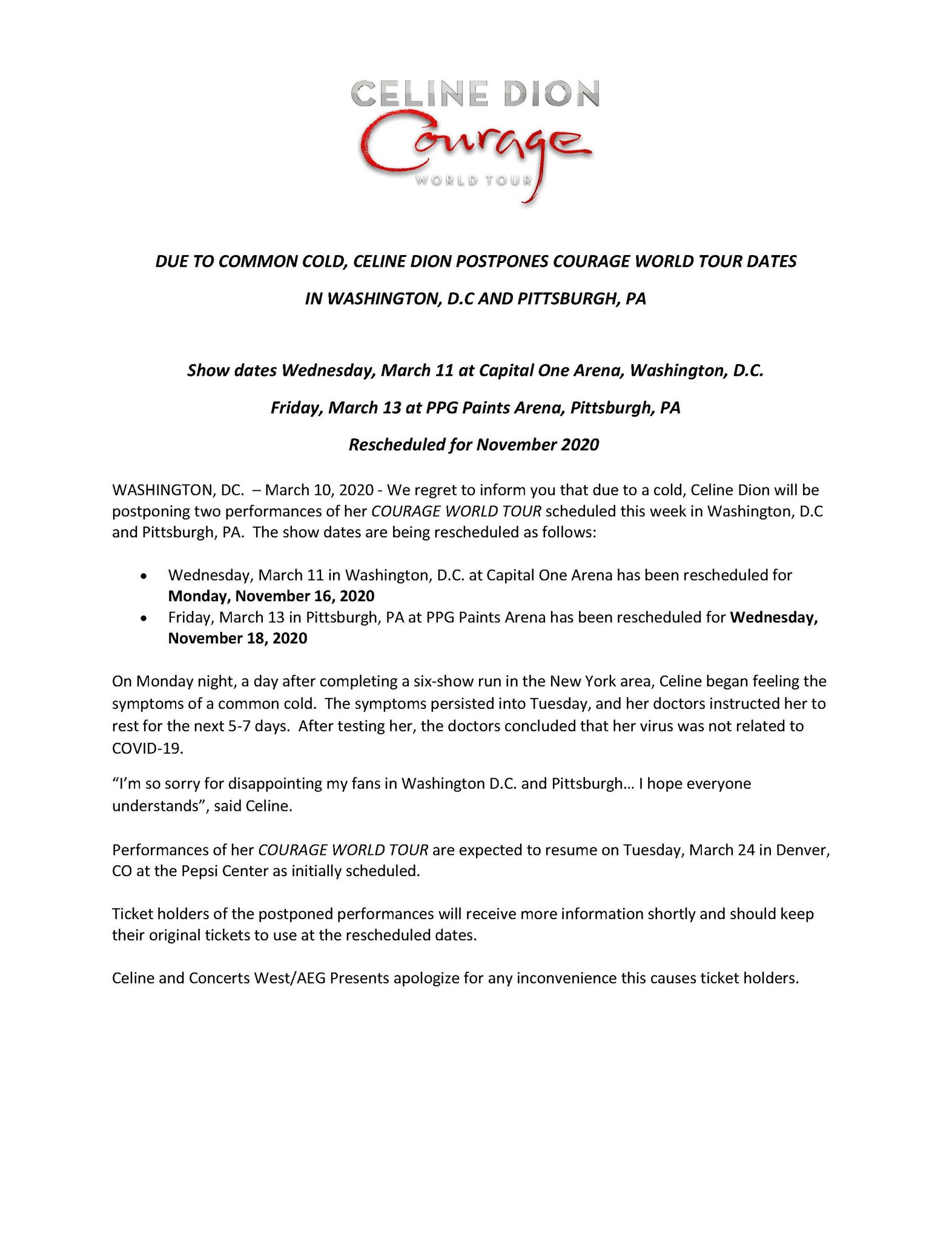 Capital One Arena On Twitter Postponed Due To A Common Cold Celine Dion Has Postponed Her Performance Originally Schedule For Tomorrow Night To November 16 2020 Please See Statement From Tour Below